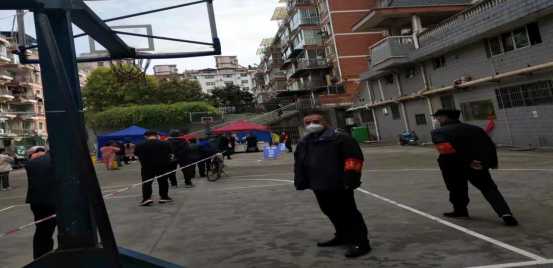 (圖為向安華同志在湖天一色小區(qū)核酸現(xiàn)場維持秩序)